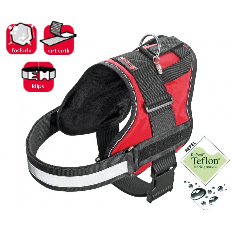 Ev dışı kullanım için uygun, kilit mekanizmalı, reflektörlü, metal parçaları krom kaplama, aşırı sıkmayı önleyici mekanizmaya sahip teflon göğüs tasması. İsimliği vardır. Kir ve toza karşı dayanıklıdır; uzun yıllar boyunca yeni görünümünü kaybetmez. 55-68 cm uzunluk. 40 mm kalınlık. S boy. Kırmızı.