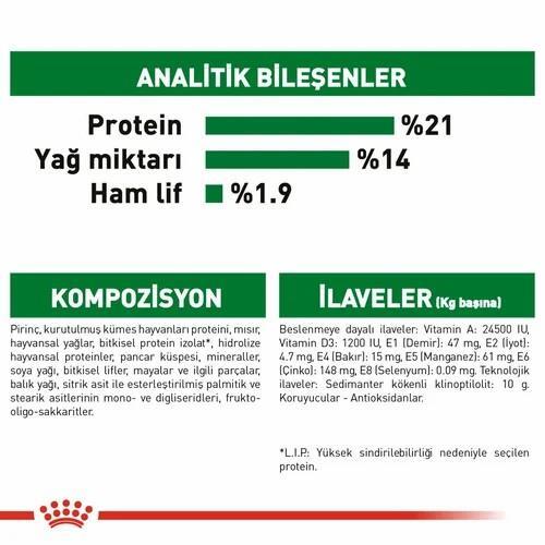 ROYAL CANIN® Mini Indoor Adult, yağ asitlerinin mobilizasyonunu sağlayan ve enerji metabolizmasında rol alan L-Karnitin içerir. Özel olarak uyarlanmış kalori içeriği, köpeğinizin ideal vücut ağırlığını korumaya yardımcı olur. ROYAL CANIN® Mini Indoor Adult içeriğindeki formül, köpeğinizin deri ve tüy sağlığını desteklemeye yardımcı olan Omega-3 yağ asitleri ile zenginleştirilmiştir.